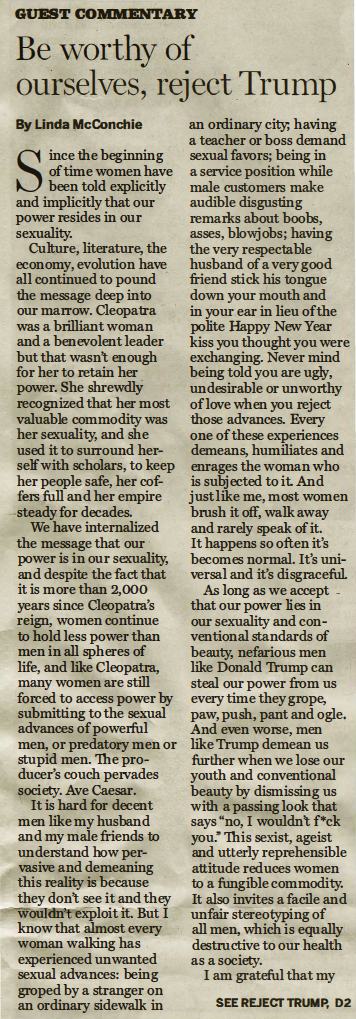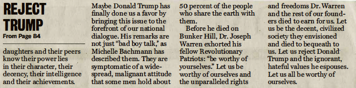 Bring forth a candidate who doesn't constantly lie, even many times an hour, utterly vitiating any possibility for trust. Who doesn't trash our democracy with authoritarian bombast. But most of all, someone who does treat everyone – most especially women – with respect.
