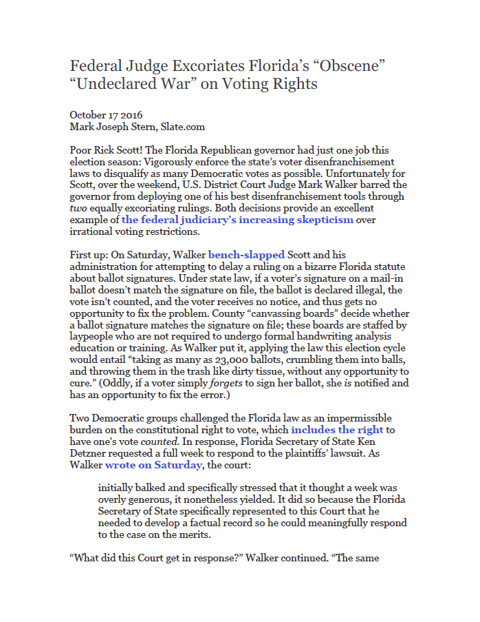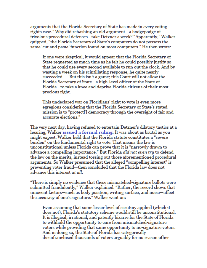 In the process of excoriating Florida Republicans for trying to suppress the vote, federal judge Mark Walker gave us some classic lines: