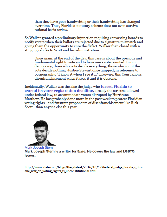 - "… the State of Florida has categorically disenfranchised thousands of voters arguably for no reason other than they have poor handwriting or their handwriting has changed over time."